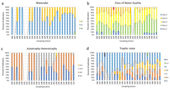 Bioindication histograms for dynamic of species-indicators of the Watanabe saprobity (a), Class of water quality according to species-specific Index S (b), type of nutrition (c), and trophic state (d) over sampling stations in the Anabar River in 2008, Eastern Siberia, Russia (no. of sampling stations as in Table 1). Abbreviations of the ecological groups: Organic pollution indicators according to Watanabe et al., 1986 [29]: sx—saproxenes; es—eurysaprobes; sp—saprophiles. Class 1–5 of organic pollution indicators according to species-specific Index saprobity of Sládeček, 1986 [30]. Autotrophy-Heterotrophy, Nutrition type as nitrogen uptake metabolism (Van Dam et al., 1994) [31]: ats—nitrogen-autotrophic taxa, tolerating very small concentrations of organically bound nitrogen; ate—nitrogen-autotrophic taxa, tolerating elevated concentrations of organically bound nitrogen; hne—facultative nitrogen-heterotrophic taxa, needing periodically elevated concentrations of organically bound nitrogen; hce—obligate nitrogen-heterotrophic taxa, needing continuously elevated concentrations of organically bound nitrogen. Trophic state indicators (Van Dam et al., 1994) [31]: (ot—oligotraphentic; om—oligomesotraphentic; m—mesotraphentic; me—mesoeutraphentic; e—eutraphentic; he—hypereutraphentic; o-e—oligo- to eutraphentic (hypereutraphentic)).