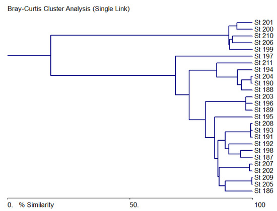 Cluster analysis of species saturation and abundance in phyla, representation of indicators of various groups, and water chemistry at observation stations are shown in Figure 10. Here, you can see two clusters separated at the level of 20% similarity and forming ecosystem variables of stations 199–201, 206 and 210 as the most similar in the first cluster and the rest that do not differ significantly in the second cluster. The first cluster contains stations from the lower reaches of the Bolshaya Kuonamka before its confluence with the Malaya Kuonamka, as well as the Anabar River after the confluence of the Udzha River and the lower mouth part of the Anabar River. These areas coincide with the map of Figure 9c, where the WESI index is increased, i.e., the waters do not have a toxic effect on phytoplankton.