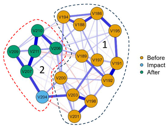 JASP network plot for biological and chemical data in the sampling stations of the Anabar River water course in 2008, Eastern Siberia, Russia (no. of sampling stations as in Table 1). Station 204 is identified as a suspect due to the impact of pollution from mining facilities in the section of the river between stations 203 and 204. The remaining stations are designated before (186–203) and after (204–211). The line thickness is related to the correlation rate on the type of analysis “Huge” correlation > 0.5 (significant only). Blue lines are positive correlation, red lines are negative correlation. Dashed lines outlined clusters: 1 combine stations before impact; 2 outline stations of impact and after it.