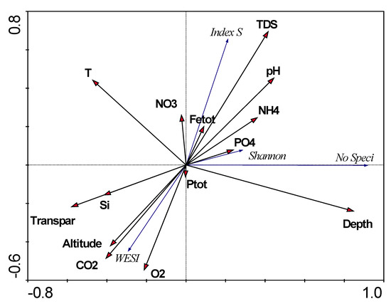 Statistical comparison of relationships between biological and environmental indicators for stations on the Anabar River was carried out with the construction of an RDA plot (Figure 12). The plot shows the chemical factors, in terms of their impact on the biological parameters of phytoplankton, were generally divided into two sets. The first grouped nitrates, phosphates, ammonium, pH and TDS, the influence of which led to an increase in the saprobity index S, which is associated with anthropogenic pollution. The second set of variables included oxygen and carbon dioxide concentrations, water transparency, silicon, and the station’s elevation above sea level. An increase in these parameters is associated with a decrease in the saprobity index S and an increase in the WESI index, with more pure-water habitats in the upper section of the Anabar River basin. Separately, there are such variables as water temperature and the depth of the sampling station that are controversially related, but an increase in depth and a decrease in water temperature led to an increase in species richness and are related to the stability of the phytoplankton structure through the Shannon index.