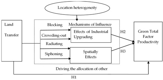According to the above theory analysis, we advance the following mechanism of land transfer affecting green total factor productivity (Figure 1):