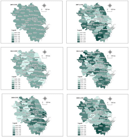 Spatial distribution patterns of GTFP and land transfer in the Yangtze River Delta region in 2007, 2013, and 2020.