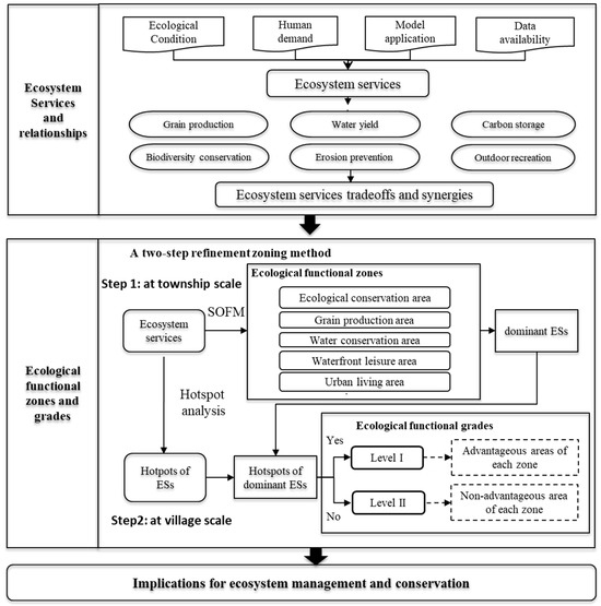 In the methodological aspects, scholars have developed many quantitative methods to carry out ecological functional zoning, and the relevant methods have evolved from the qualitative methods by a priori knowledge to quantitative methods such as simple overlay analysis, regression analysis and principal component analysis. Wang [29] used a multi-criteria decision analysis technique to delineate the ecological red lines in Hangzhou Bay. Bailey [30] drew a block map for the ecological environment in a region, analyzed the ecological problems, and evaluated the whole ecosystem, providing a holistic spatial cognition on ecological management. Mamat [31] adopted the sensitivity analysis method to zone the cultural heritage sites in the Turpan region according to the condition and spatial variability characteristics of ecosystems based on the theory of nature reserve zoning. Cao [32] utilized an integrated approach of trade-off analysis, hotspot identification and clustering algorithm to identify the priority zones for cropland protection and propose corresponding policy guidelines. With the development of computer technology and the methods of big data, machine learning methods are also increasingly applied to ecological functional zoning. Neural networks, especially self-organized mapping network (SOFM) algorithms, have attracted much attention due to their accuracy, intelligence, and efficiency in processing data [17,19]. Zhang [28] and Fei [33] applied SOFM models to identify the functional zones of ESs in China’s coastal protection forest areas and the Qiantang River Basin, respectively, aiming to provide sustainable spatial planning and management strategies. Although previous studies have developed various models to determine EFZs, there is still a gap in integrating the existing methods to refine the EFZs at a finer scale on the basis of determining EFZs.
