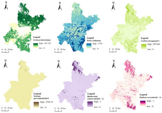 The spatial distributions of ESs in Wuhan are shown in Figure 3. Generally, except for erosion prevention service, other services displayed a spatial characteristic of “lower values in the central region and higher values in the city’s periphery”. The values of grain production service ranged from 0 to 3.74 × 107 kg, which were generally higher in the northern region than in the southern region, but lower in the southwestern and western parts of the city. This is mainly because the northern part of Wuhan is richer in arable land resources than the southern part, and there is more concentrated and continuous basic arable land, while there is less arable land distributed in the city center. The water yield service ranged between 0 and 1570 mm, which was generally higher in the south than in the north, higher in the east than in the west, and higher in the surrounding area than in the center, especially in the areas where water is concentrated. The distributions of the carbon storage service showed a pattern of lower values in the city center and higher values in the surrounding areas, in which the high values of carbon storage service arose in the northwestern Mulan Mountain area, the northeastern General Mountain area, and the southeastern region, and the low values of carbon storage service were widely distributed within the central city. The value range of erosion prevention service was 0–333.02 t/ha, with high values mainly concentrated in the mountainous area in the northern part of Huangpi District and the area of the Dabie Mountain remnants in the northeastern part of Xinzhou District, and sporadically distributed in the southern and southwestern parts of the city. The rest of the area had a relatively low level of erosion prevention service. The biodiversity conservation service was in the range of [0, 1], with high values occupying a small area proportion centered in the northwest, northeast, and south, where forests are largely distributed, and low values concentrated in the rest of the area. The value of outdoor recreation service ranged between 0 and 1, with high values centered in the mountainous area in the north of Huangpi District and Xinzhou District, and water areas (e.g., rivers and lakes) in the south of Jiangxia District, and scattered in the southwestern and central parts of the city.