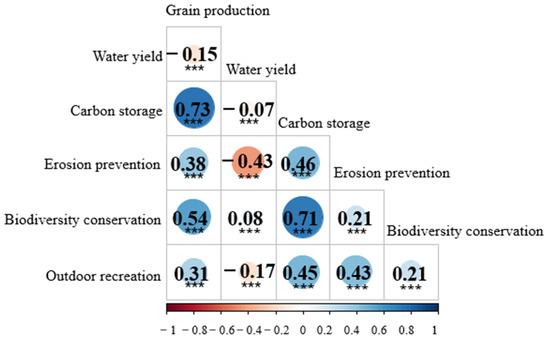 Figure 4 illustrates the correlation between each pair of ESs, revealing significant relationships between all pairs of ESs, among which four pairs showed negative correlations and eleven pairs showed positive correlations. The strongest relationship occurred between carbon storage and grain production services, with a correlation coefficient of 0.73, while the weakest arose between carbon storage and water yield services, marked by a coefficient of −0.07. Specifically, grain production service exhibited a synergistic relationship with carbon storage, erosion prevention, biodiversity conservation, and outdoor recreation services, with the most pronounced synergy with carbon storage service. Conversely, water yield displayed trade-off relationships with carbon storage, erosion prevention, and outdoor recreation services, showing the strongest tradeoff relationship with erosion prevention service with a correlation coefficient of −0.43. Carbon storage also aligned synergistically with erosion prevention, biodiversity conservation, and outdoor recreation services, with the strongest correlation, notably, with biodiversity conservation service. Additionally, erosion prevention showed strong synergy with biodiversity conservation service and even stronger synergy with outdoor recreation service. Although the biodiversity conservation and outdoor recreation services were synergistically correlated, the strength of this relationship was comparatively weak.