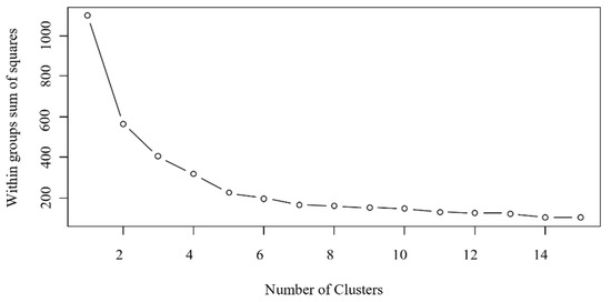 Change in within-group sum of squared errors with number of clusters in self-organized mapping network process.