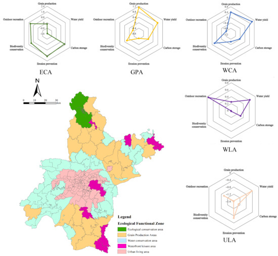 The mean values of ESs and the land use compositions within each ecological functional zone are shown in Figure 6 and Figure 7. According to the characteristics of ESs and land use composition in each zone, the five types of EFZs were named ecological conservation area (ECA), grain production area (GPA), water conservation area (WCA), waterfront leisure area (WLA) and urban living area (ULA).