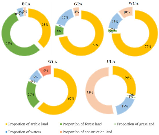 Land use composition within each ecological functional zone (ECA: ecological conservation area; GPA: grain production area, WCA: water conservation area, WLA: waterfront leisure area; ULA: urban living area).