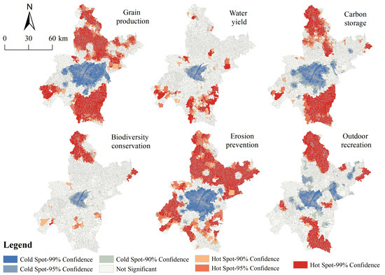 The results of the hotspot analysis of ESs are shown in Figure 8. It can be seen that each ecosystem service showed a spatial differentiation, in which the coldspot areas were all concentrated within the main urban areas. The coldspot areas for grain production and biodiversity conservation services were the largest in spatial distribution, and the coldspot areas of the water yield and erosion prevention services were relatively small. The notable hotspot areas of the grain production service were concentrated in the villages of Huangpi and Jiangxia Districts, the southern part of Xinzhou District, and the southern villages of Caidian District. The hotspots of the water yield service were mainly located in the south of Caidian and Jiangxia Districts, and there were also small-scale block distributions throughout the city. The spatial distributions of the carbon storage and outdoor recreation hotspots were very similar, with hotspots concentrated in the north and south of Wuhan, where extensive forests exist, scattered in the northeast and southwest. The distribution of hotspot areas for the erosion prevention service was the smallest, mainly concentrated in villages in the northern part of Huangpi District, followed by villages in the central part of Jiangxia District and the northeastern part of Xinzhou District. The hotspot for the biodiversity conservation service exhibited the widest distribution, showing a clear spatial characteristic of “low in the center and high in the surrounding”.