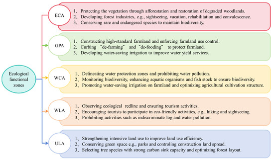 Firstly, our study delineated five types of EFZs with varied combinations of ESs and compositions of land use types. We could implement differentiated management strategies to leverage dominant ESs and improve non-dominant ESs in different zones. The dominant ESs play a fundamental role in maintaining the sustainability and functionality of an ecosystem, which should be emphatically protected and restored so as to promote the sustainable development of the ecosystem. However, this does not mean that the non-dominant ESs (erosion prevention in this example) within a zone are not worth attention. We could also implement some management and engineering measures to improve the capacity of ecosystems to provide non-dominant ESs, but in most cases, this improvement is limited. Taking the GPA as an example, the ecosystem in this zone exhibited a strong capacity to provide grain production and water yield services, but had a weak capacity to provide erosion prevention. Possible measures, including enhancing the construction of high-standard farmland, and strictly controlling the conversion of farmlands to other land use types, are encouraged to maintain the grain production service in this zone. Additionally, strengthening water-saving irrigation and other engineering constructions could leverage the region’s capacity to provide a high-level water yield service. Moreover, measures like slope protection and terracing, and forests and grasses planting, could reduce the zone’s soil erosion risk, so as to enhance the capacity to provide an erosion prevention service. Due to the limited space, the policy guidance for implementing management strategies in five types of EFZs was summarized in Figure 10.