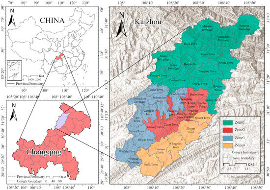 According to the criteria for regionalization of the Urban-rural Master Planning of Kaizhou District, Chongqing (2015–2035), the district is divided into the Dongli Ecological Protection Zone (Zone 1), the Round-the-Hanfeng Lake Urban Functional Zone (Zone 2), the Jiangli Agricultural Development Zone (Zone 3), and the Puli Characteristic Industrial Zone (Zone 4), as shown in Figure 1. The Dongli Ecological Reserve functions as the primary zone for ecological protection, resource conservation, and water preservation. Its focus lies in developing the Kaizhou ecological exhibition area and serving as a key production hub for ecological products. The Round-the-Hanfeng Lake Urban Functional Zone consolidates district-level roles in politics, economy, science, education, culture, tourism, and modern services, forming the core of urban functions. The Jiangli Agricultural Development Zone highlights Kaizhou’s status as a major national agricultural production center, with efforts directed at building a modern national agricultural demonstration zone. Meanwhile, the Puli Characteristic Industrial Zone spearheads new industrialization and urbanization, concentrating on attracting industries and populations and promoting coordinated development and industrial integration.