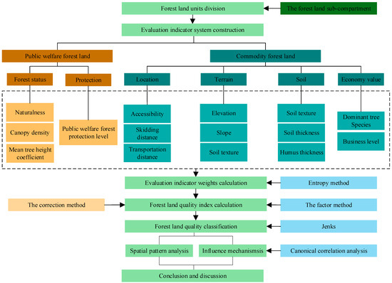 According to the theory of management of forest classification, forests can be divided into public welfare forests and commodity forests [38]. Among them, the public welfare forests have many forest ecological service functions such as water conservation, carbon sequestration and oxygen release, biodiversity, and soil conservation [39], with the goal of maximizing ecological benefits. While the commodity forests should pursue the maximum economic benefits, providing timber and forest products to society [38]. It can be seen that there is an essential difference between the two types of forest land management. Therefore, this article evaluated the quality of public welfare forest land and commodity forest land, respectively. On the one hand, this article focused on the ecological quality evaluation of public welfare forest land in order to enhance carbon sequestration in forest land. On the other hand, it also evaluates the economic benefits of commodity forest land to promote the high-quality development of forestry. This could effectively improve the substitution capacity of forest products, indirectly reducing carbon dioxide emissions in the atmosphere. Accordingly, the framework of this study is shown in Figure 2.