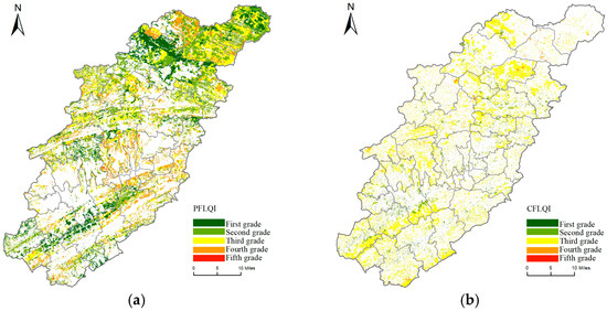 Using the classification tool in ArcGIS 10.8.2, the Jenks natural breaks method was selected to divide the quality index into five levels, ranging from 1 to 5, to further explore the spatial distribution differences in forest land quality. The grading criteria for PFLQI/CFLQI were as follows: when PFLQI/CFLQI ≥ 85.72, it was classified as first grade. When 71.43 ≤ PFLQI/CFLQI < 85.72, it was second grade. When 57.14 ≤ PFLQI/CFLQI < 71.43, it was third grade. When 42.86 ≤ PFLQI/CFLQI < 57.14, it was fourth grade. When PFLQI/CFLQI < 42.86, it was fifth grade.