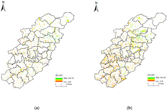 Due to the limited size of forest sub-compartments, it was not feasible to measure the NPP of all forest sub-compartments. Therefore, the study measured the NPP of 666 sub-compartments of public welfare forest land and 1606 sub-compartments of commodity forest land. As shown in Figure 5a, the net primary productivity for public welfare forest land (PFLNPP) ranged from 0.00 to a maximum of 1011.30. Similarly, as illustrated in Figure 5b, the net primary productivity for commodity forest land (CFLNPP) ranged from 0.00 to a maximum of 1015.60.