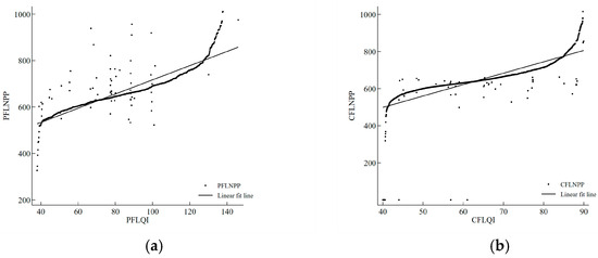Scatter plot and best-fit line of correlation between net primary productivity and forest land quality index. (a) shows the scatter plot and best-fit line of the public welfare forest land. (b) shows the scatter plot and best-fit line of the commodity forest land.
