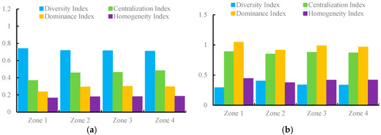 As shown in Figure 7a, the diversity index of PFLQG in each zone of the Kaizhou District was generally high, with the lowest in Zone 4, though it still reached 0.707, indicating that the PFLQG was diversified. The highest dominance index was in Zone 3, and the lowest was in Zone 1, which was consistent with the centralization index. The homogeneity index of public welfare forest land quality grade in all four zones was less than 0.2, indicating that the spatial distribution of PFLQG in various regions of Kaizhou District was relatively uneven.