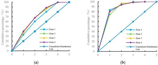 According to Figure 8a, the PFLQG Lorenz curve of Zone 1 was closest to the uniform distribution line, indicating that its PFLQG distribution concentration was the least concentrated. This result is consistent with the findings from the centralization index and dominance index analyses. According to Figure 8b, the CFLQG Lorenz curves for the four zones deviated significantly from the uniform distribution line, suggesting a high concentration of CFLQG distribution within each zone of the Kaizhou District. In summary, there were notable differences in the quality and structure of forest land across various regions of Kaizhou District, highlighting the objective existence of spatial heterogeneity.
