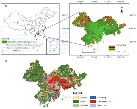 Location of the study region. (a) Location in China, and (b) the spatial distribution of different land cover types in PRD.
