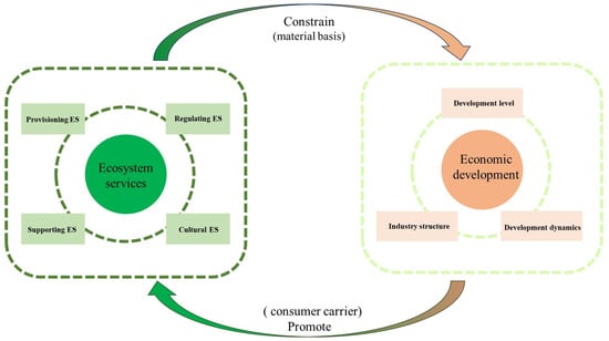 The socio-economic system and the natural ecosystem are closely related to the survival and development of human beings. There are nonlinear and open dynamic changes between them, causing them to interact and organically unify. The adjustment of the system’s structure and optimisation of its function can be realised based on coupling coordination research. The coupling coordination relationship between the two systems is summarised in Figure 2. Ecosystem services include the supply services, regulation services, support services, and cultural services utilised by human beings and constitute the material basis for socio-economic development. Socio-economic development is the driver of the use of ecosystem services, and any increase in this development strengthens the degree of access to the ecosystem. If the demands of the social–economy exceed the limits of development, it will inevitably be restricted by the ecosystem. When socio-economic development reaches a certain level, human beings can promote regional synergic and high-quality development by formulating policies for the sustainable development of the local social–economy and ecosystem.