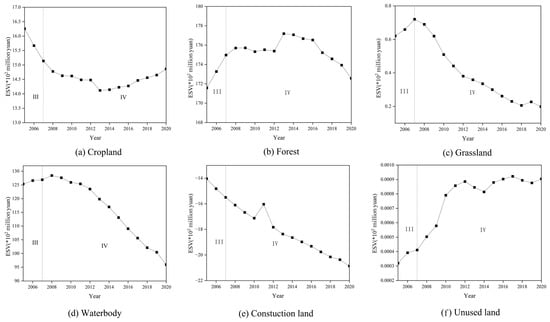 Ecosystem services exhibit different characteristics in different urbanisation stages []. Compared with the existing research on the stages of urbanisation [,], the urbanisation process in the PRD can be divided into a stage III mature period (70–80%; 2005–2007) and a stage IV post-mature period (>80%; after 2008). During the research period, the urbanisation process in the PRD was in stages III and IV (Figure 3 and Figure 4). From the perspective of the temporal evolution, the total value of the ecosystem services in the PRD exhibited a decreasing trend. Among them, the total ESV increased in stage III and decreased significantly in stage IV. The ESV of the different land types exhibited different evolution characteristics; that is, in stage III, the ESV of the cropland continued to decrease, the absolute ESV of the construction land services continued to increase, and the ESV of the forests, grassland, water bodies, and unused land continued to increase. The forests and water bodies had a significant positive effect on the total ESV, and the construction land had a significant negative effect on the total ESV. In stage IV, the ESV of the construction land and unused land increased, and the ESV of the cropland, forests, grassland, and water bodies decreased. During the entire study period, the cropland, forests, water bodies, and construction land greatly influenced the total ESV in the PRD, indicating that the occupation of cropland, forests, and water bodies by urban construction during the urbanisation process was the core factor leading to the decrease in the total ESV.