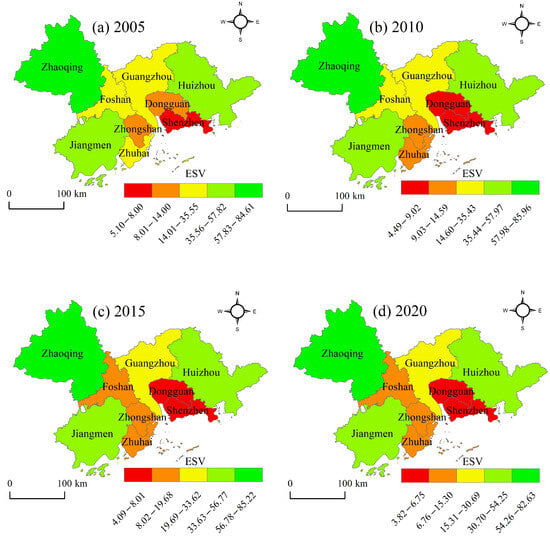 Spatial distribution of ESV in the PRD urban agglomeration from 2005 to 2020.