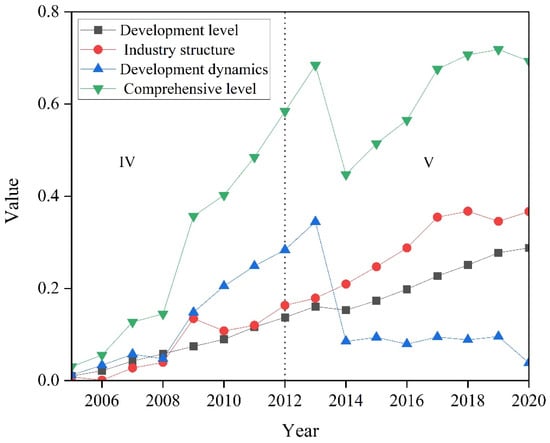 A comprehensive index of economic development was obtained using the weighted sum of the entropy method. The results show that the vitality of the development had a great influence on the comprehensive level of the economic development. Combined with Chenery’s economic stage division standard [], the economic development in the PRD was divided into five stages: stage I—primary product production (before 1993); stage II—early industrialisation (1994–2001); stage III—medium industrialisation (2002–2005); stage IV—late industrialisation (2006–2011); and stage V—early developed economy (after 2012). Throughout the study period, the economic development in the PRD occurred in the later part of stage IV (industrialisation; 2005–2011) and stage V (developed economy; 2012–2020). From the perspective of the time series, the comprehensive level of economic development in the PRD significantly improved, especially in stages IV and V, after 2008. The main reasons for the slowdown in stage V include the low demand for foreign trade, a decline in real estate growth, the weakening of the domestic trade driving force, the erosion of corporate profits by structural inflation, and a rise in commodity prices (Figure 6).