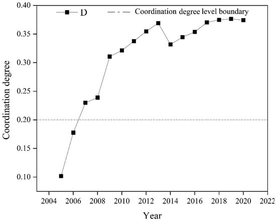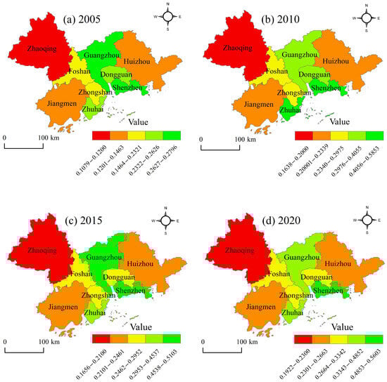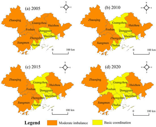 From 2005 to 2020, the two dimensions of the coordination degree in the PRD exhibited a spatial distribution, with the cities along the Pearl River Estuary serving as the core, showing gradually decrease in this degree towards the periphery of the circle. The regional differences gradually decreased, and the coordination level evolved from moderate imbalance to basic coordination (Figure 9). In 2005, the coordination degree in the PRD urban agglomeration ranged from 0.31 to 0.46, indicating a state of mild imbalance to basic coordination, and the overall level was poor. Among the cities, Shenzhen, Zhuhai, and Dongguan exhibited basic coordination, and the others exhibited moderate imbalance. By 2020, the coordination degree in all of the cities in the PRD’s urban agglomeration had improved, ranging from 0.35 to 0.49, and the overall change was from moderate imbalance to basic coordination. Among them, Guangzhou, Foshan, and Zhongshan rapidly attained basic coordination, while Zhaoqing, Jiangmen, and Huizhou remained in a state of moderate imbalance.