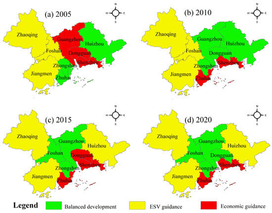 From 2005 to 2010, the number of balanced development cities increased slightly; the number of ESV guidance cities did not change; and the number of economic guidance cities decreased from three to two. From the perspective of the spatial distribution of the types of evolution, the balanced development cities were concentrated in the east, the ESV guidance cities were concentrated in the west, and the economic guidance cities were mainly distributed along the Pearl River Estuary. From 2010 to 2015, the number of balanced development cities decreased slightly. The number of ESV guidance cities did not change, but the spatial disparity was more significant. The number of economic guidance cities increased from 2 to 3. The characteristics of the spatial distribution of the types during this period showed that the area of balanced development cities shrank towards the west, the area of the economic guidance cities shrank towards the north, and the ESV guidance cities exhibited a dispersed pattern. From 2015 to 2020, only the balanced development and economic guidance cities changed. Among them, the area of the balanced development type spread southward, the economic guidance type exhibited a uniform distribution on the east and west sides of the Pearl River Estuary, and the ESV guidance type still exhibited a dispersed distribution.