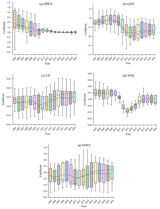 According to the GTWR model, a regression analysis of the driving factors of the coupling coordination degree between the ESV and the economy in the cities in the PRD during the study period was carried out, and box plots of its evolution were drawn based on the regression coefficients of these factors (Figure 11).