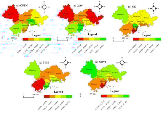 From the perspective of the natural factors, the coefficients of the TEM were mostly negative, with the exception of those in Shenzhen, Zhuhai, and Zhaoqing. An increase in temperature often has an inhibitory effect on grasslands and forests [], which leads to the heat island effect and restricts coupling and coordinated development. The coefficients of the NDVI were positive in the north and negative in the south, exhibiting significant agglomeration characteristics. The promoting effect extended from Zhaoqing to the east, and the inhibiting effect extended from Zhuhai to the surrounding cities.
