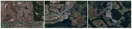 Three types of settlements in Anxin County: (a) Land settlements. (b) Semi-waterside settlements. (c) Water settlements.