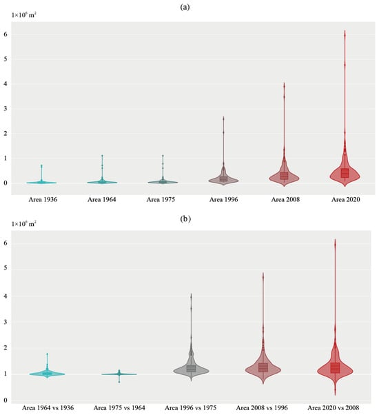 The area evolution of Anxin County’s settlements: (a) area evolution; (b) area increase evolution.