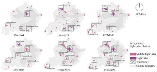 Figure 6 displays the clustering of areas with a high local spatial autocorrelation for area change ( area) between consecutive study years. There was significant expansion in the area between Anxin Town center (as well as the center of the whole county) and Santai Town center. The settlements around them were influenced by the radiation effect of the two county-level centers, and they have abundant land resources, leading to rapid development. Other township centers also experienced evident expansion, including Laohetou Town, Luzhuang Town, Tongkou Town, Duancun Town, and Liulizhuang Town. However, the settlements around them did not experience significant expansion, and they failed to form a development band like Anxin-Santai Town. In summary, most settlements with a high-value clustering of growth are near water bodies or located at the edge of the county, but they experienced a driving effect from outside.
