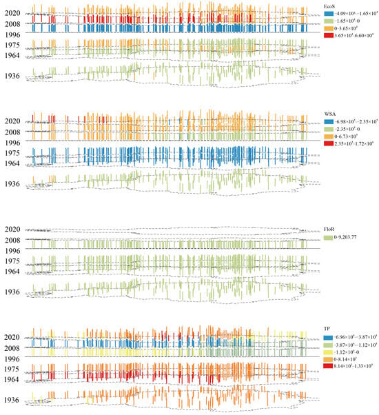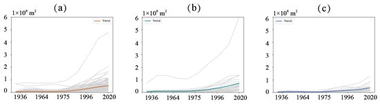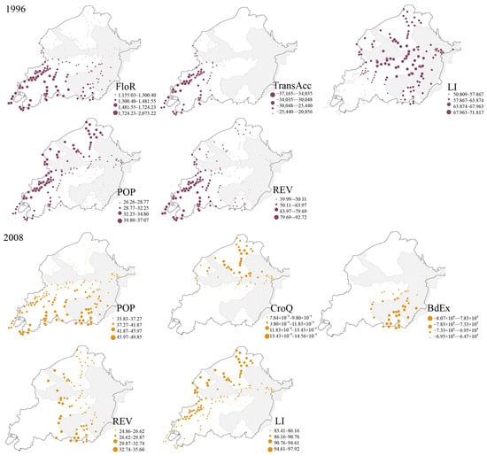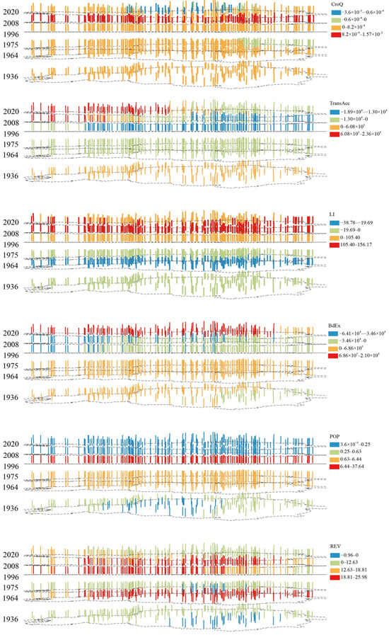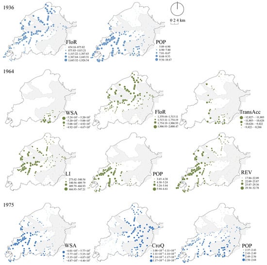 Following the results of spatial autocorrelation, the Area, which allows for distinct spatial clustering, was selected as this study’s explanatory variable. The values of all indicators for the study period were computed and then utilized in the subsequent modeling of Area in the following years. For instance, the variable indicators for a settlement in 1936 correspond to the Area in the period of 1936–1964. Ultimately, this led to the formulation of five GWR models.