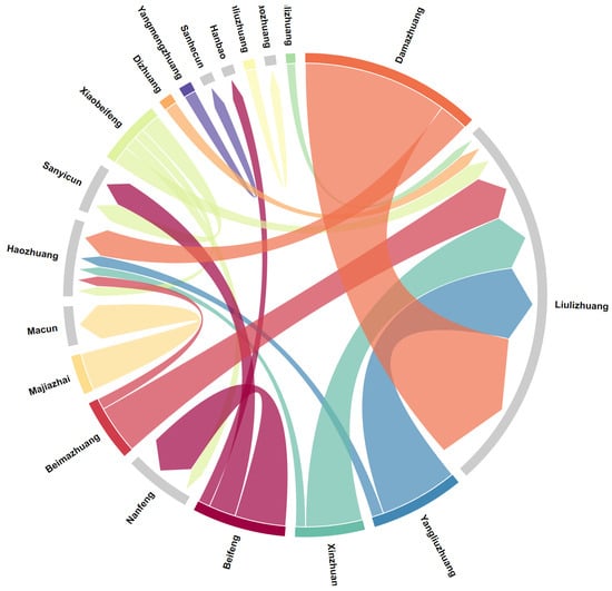 Due to the possibility of retrieving multiple demand point villages within the search radius of each supply point village, it is necessary, based on the calculation results from Equation (12) and the value, to identify the optimal target village for each migration village . The attractiveness function, , of the target village for the migration village was selected for this purpose, and the maximum value was chosen as the best result.