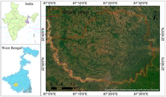 The southwestern region of West Bengal, India, is known for its fragmented forest cover due to human encroachments [24,25]. We selected the Midnapore forest division of the southwestern region for this study, which extends from 22°23′31″ N to 22°47′59″ N and 87°0′13″ E to 87°34′42″ E (Figure 1). The study area covers an area of about 1822.91 km2, with forest land accounting for approximately 24.85% of the total study area [26]. The forests are tropical dry deciduous, and are characterized by the prevalence of tree species such as Shorea robusta, Acacia auriculiformis, Anacardium occidentale, Diospyros melanoxylon, Terminalia bellirica, Tectona grandis, Madhuca longifolia, and Albizia lebbeck [27]. The climate is AW (Tropical savanna) with a yearly rainfall of 1502.8 mm, an average temperature of 27 °C, and a relative humidity range of 63% (February) to 81% (September) (https://www.timeanddate.com: accessed on 12 March 2023). In terms of topography, the study region is a plateau peripheral zone with elevations of 3–112 m above MSL and slopes of 0–24.42 degrees.