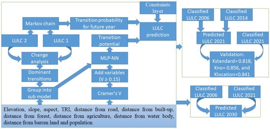 Methodological flow chart for LULC prediction. LULC: land use land cover; MLP-NN: Multi-Layer Perceptron Neural Network.