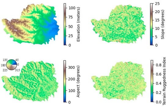 Land cover transitions are affected by several drivers [57]. Therefore, drivers are considered according to their availability and their impact on LULC changes. A total of ten factors, such as elevation, slope, Terrain Ruggedness Index (TRI), aspect, distance from built-up, distance from water body, distance from forest, distance from road, distance from agriculture land, distance from barren land, and population were considered as drivers for all transitions (Figure 3 and Figure 4). The vector road data (primary, secondary, and tertiary roads) were collected from OpenStreetMap. The distance from the road was computed using Euclidean distance in the spatial analyst tools of ArcGIS (version 10.4.1). SRTM-DEM elevation data were collected from GEE (see Section 2.2.1 “Satellite data”), and then slope, aspect, and TRI were computed in ArcGIS. Forest land, water bodies, built-up land, agricultural land, and barren land were derived from the LULC map, and the distance from built-up, forest land, agriculture land, water body, and barren land were computed using Euclidean distance in the spatial analyst tools of ArcGIS. The distance measurement indicates how far a particular point is from the nearest area of each specified land type. The World Pop population data (https://www.worldpop.org/, accessed on 22 August 2024) available in GEE were employed to extract the population. After that, Cramer’s V was calculated for these drivers. We selected variables having Cramer’s V ≥ 0.15 for the transition potential analysis, as they are generally considered useful [59].