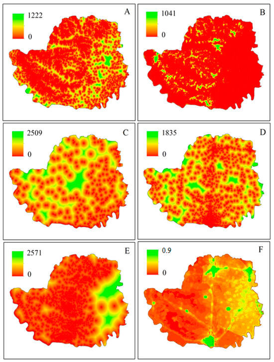 Dynamic variables: assuming that these variables change over time. (A) Distance from forest land (meters); (B) distance from agriculture land (meters); (C) distance from water body (meters); (D) distance from built-up land (meters); (E) distance from barren land (meters); (F) population (number/sq.m).