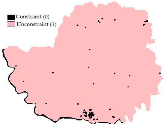 The Markov chain model was used to generate transition probability for the future, indicating the land that is expected to change from the subsequent date to the anticipated date. This is based on converting one class to another by using the conditional probability between the earlier and later LULC maps [59]. A constraint layer was also added for areas that were not expected to change in the future. We used preserved parks, airports, and major buildings as administrative constraints, and major water bodies as natural constraints. We used a value of “0” for constrained areas and “1” for unconstrained areas, as recommended by TerrSet (Figure 5). After that, we ran the model and obtained both hard predictions and soft predictions. The hard prediction indicates land use class, whereas the soft prediction predicts values ranging from zero (indicating low susceptibility to change) to one (indicating high susceptibility), reflecting their susceptibility to the change.