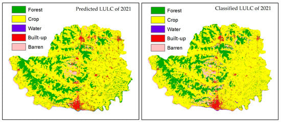Classified and predicted LULC maps for the year 2021.
