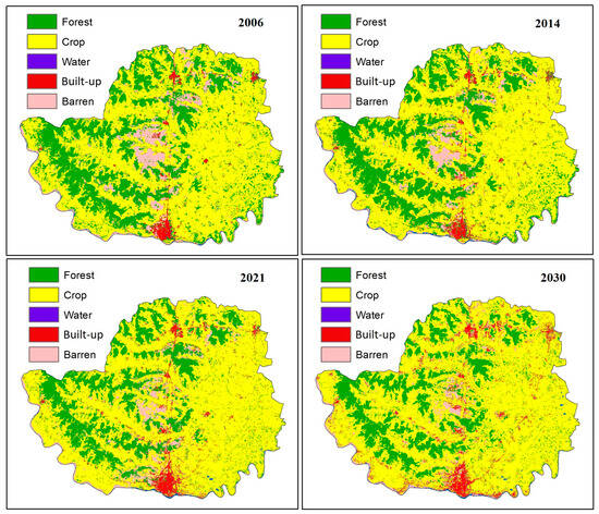 Classified LULC maps for the years 2006, 2014, and 2021, and predicted LULC map for the year 2030.