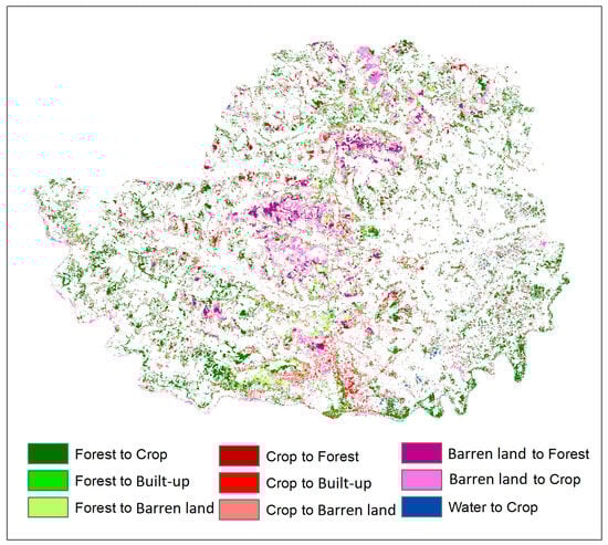 LULC changes from 2006 to 2021 are shown in Table 8. As we ignored the transitions below 500 ha for the prediction model, we identified nine dominant transitions or changes from 2006 to 2021 (Figure 8). Between 2006 and 2021, the forest area diminished by −108.606 sq. km (Table 9) and dominantly changed into agricultural land (136.068 sq. km), then into barren land (24.490 sq. km) and built-up land (13.293 sq. km). Water bodies and barren land also decreased by −2.478 sq. km and −19.401 sq. km, respectively (Table 9). Barren lands were dominantly changed into agricultural (41.597 sq. km) and forest land (26.171 sq. km), while water bodies were dominantly changed into agricultural land (7.083 sq. km). There was also an increase in agricultural land of 98.624 sq. km and in built-up land of 31.862 sq. km. The increase in agricultural land from 2006 to 2021 was mainly driven by significant reductions in forest land, barren land, and water bodies (Table 8). However, the increase in built-up land was mostly derived from agricultural land and forest land. Despite agricultural land being dominantly converted into forest, barren, and built-up land, net positive growth was observed for agricultural land due to a large amount of forest land (136.068 sq. km) being converted into agricultural land (Table 8). So, net negative growth was also observed for forest land, despite the conversion of barren land and agricultural land into forest land (Table 8). However, the two most dominant changes observed were as follows: (1) net positive growth for agriculture; (2) net negative growth for forests because a substantial portion of forest land was converted into agricultural land.