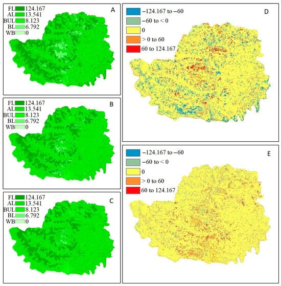 Carbon stock and sequestration in Mg/ha. (A) Carbon stock 2006; (B) carbon stock 2021; (C) carbon stock 2030; (D) carbon sequestration from 2006 to 2021; (E) carbon sequestration from 2021 to 2030. FL: forest land; AL: agricultural land; BUL: built-up land; BL: barren land; WB: water body.