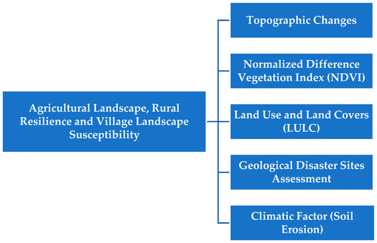 The interconnectivity of agricultural landscapes and resilient rural settlements and their transportation networks are strongly linked and connected to human activities and land-use structure [19]. Figure 1 illustrates the importance of investigating the plurality, complexity, and flexibility of traditional community roles for long-term growth, topographic changes, landscape assessment caused by degradation, natural disaster susceptibility, microclimatic abuses, soil erosion, and agricultural landscape restoration.