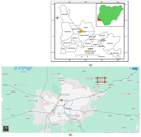 (a) Map showing the position of Alabata village, which is about 25.50 km from the city center of Abeokuta; (b) Map showing the Alabata village community and the surrounding villages. Source: Google Maps, 2024.