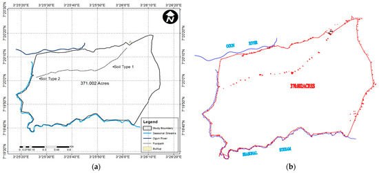 (a) The selected farm settlement is divided into different sample frames and two different locations of the soil types (1 and 2); (b) the selected farm settlement shows the perimeter boundary of the adjoining seasonal streams and the Ogun River.