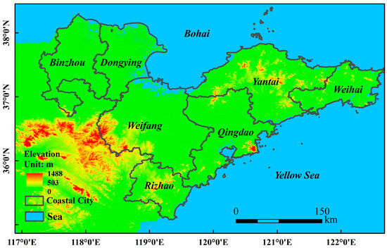 The study area covers the coastal regions of Shandong Province, including Binzhou City, Dongying City, Weifang City, Yantai City, Weihai City, Qingdao City, and Rizhao City (Figure 1). The longitude range is from 117° E to 121° E, and the latitude range is from 35° N to 39° N. The coastal areas of Shandong Province are situated between the Yellow Sea and the Bohai Sea, facing the Liaodong Peninsula across the Bohai Strait. The study area is surrounded by sea on three sides and has a temperate monsoon climate with four distinct seasons. The terrain is flat, dominated by plains, hills, and mountains. The main industries include manufacturing, marine industry, and port transportation. The coastal areas of the study area are rich in natural resources, such as tidal flats, minerals, and islands. In addition, the study area has 51 excellent harbor sites suitable for constructing deep-water berths, providing favorable conditions for the vigorous development of the marine economy in Shandong Province.