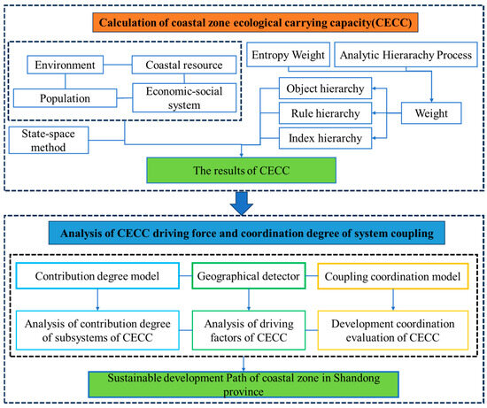 Taking the coastal area of Shandong Province as an example, this study aims to solve a scientific problem: how can multi-source data and an ecological analysis model be combined to realize dynamic monitoring and evaluation of CECC? Therefore, the main research contents of this paper are as follows: (1) Based on multi-source data, a multi-level CECC evaluation system for Shandong Province was constructed, and the coastal ecological carrying capacity of Shandong Province was calculated by a state–space model. (2) The contribution degree model was used to analyze the contribution degree of CECC subsystems to CECC. (3) Using the system coupling degree model to analyze the coupling coordination degree between the carrying capacity subsystems. (4) Exploring the driving factors of the change in CECC with the help of geographical detectors.