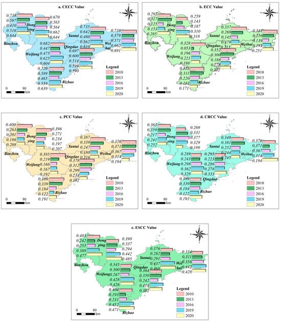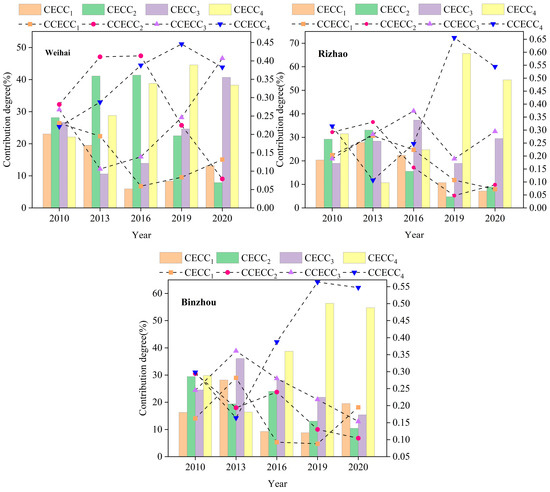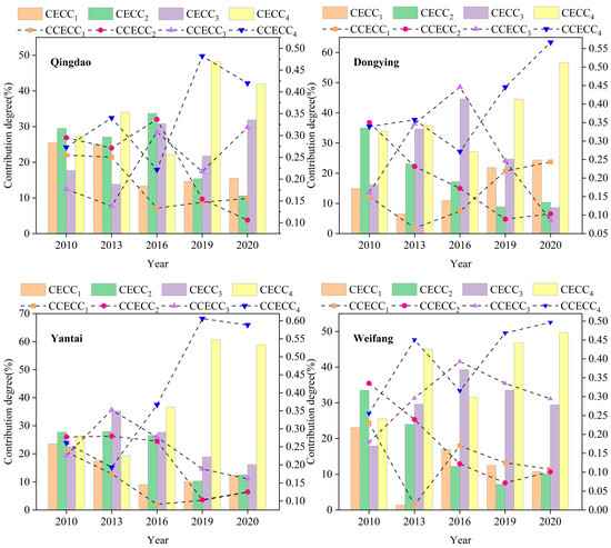 Contribution degree of factor layer indicators in coastal areas of Shandong Province from 2010 to 2020. (Note: CECC1–CECC4 represents the spatial distribution of ECC, PCC, CRCC, and ESCC, respectively. CCECC1–CCECC4 shows the contribution degree corresponding to the above parameters).